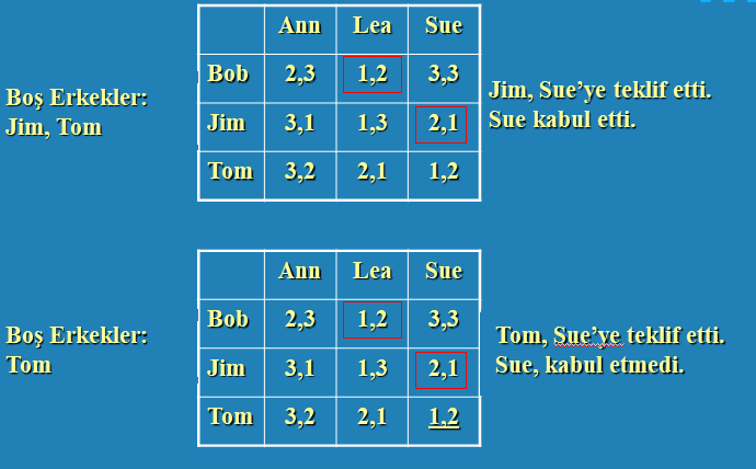 {(Bob, Ann) (Jim, Lea) (Tom, Sue)} kararsız durumda.